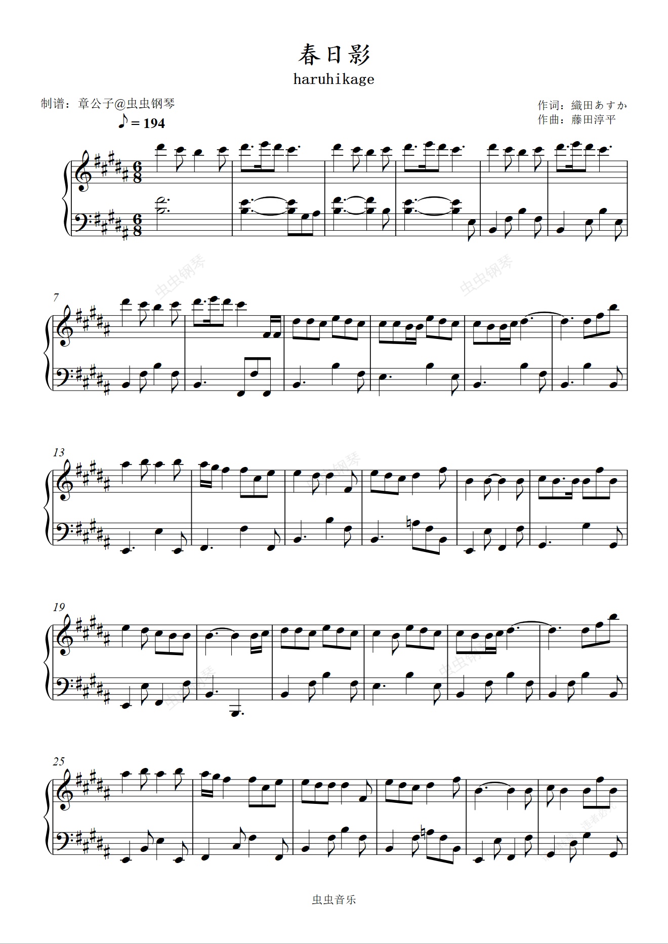 钢琴谱:春日影(haruhikage) 精简版 原调B